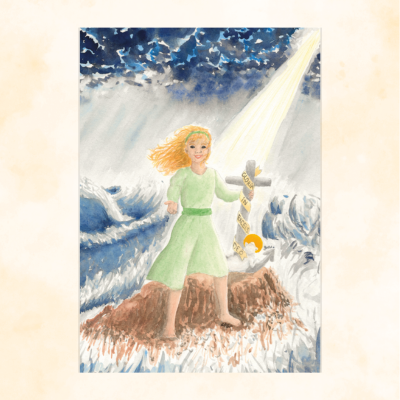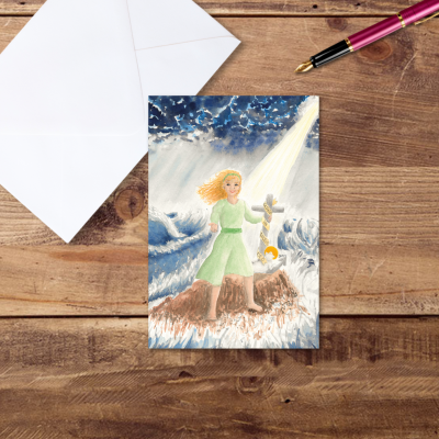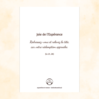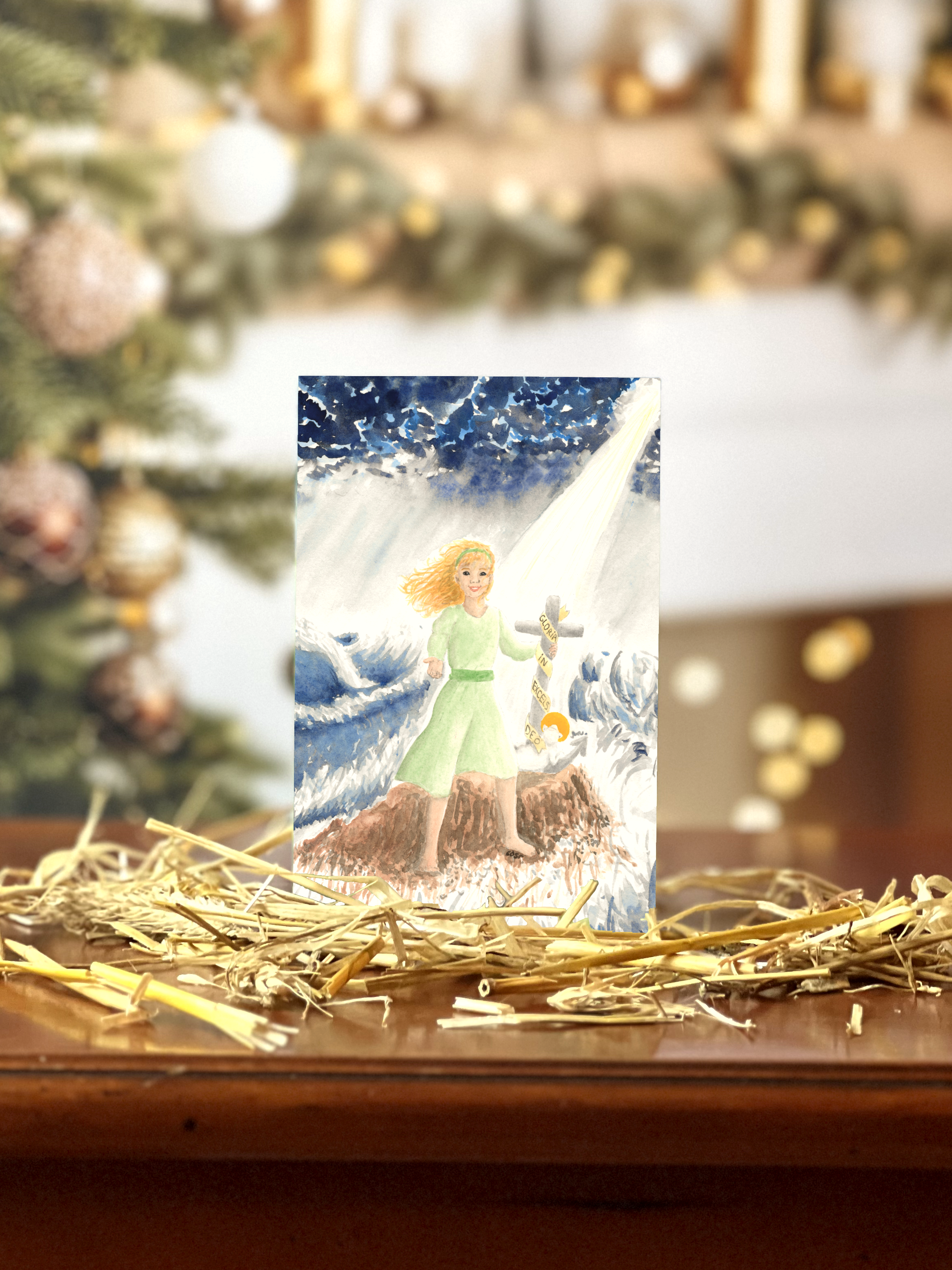 Cette carte célèbre « La Joie de l’Espérance » avec une aquarelle représentant une jeune fille vêtue de vert, ancrée dans la foi malgré les vagues tumultueuses de la vie. Un magnifique symbole de confiance et d’espérance pour débuter la période de l’Avent.